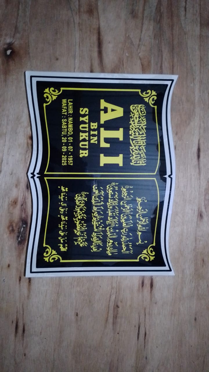 Cetak Prasasti atau Papan Nisan Bentuk Buku ALQur’a ALFatihah dan Shalawat Produk Terlaris dan Banyak yang pesan dari Kaca Mika+ACP…