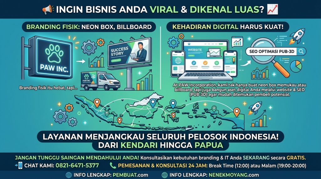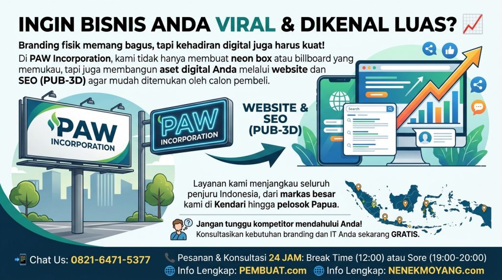 Branding fisik oke, kehadiran digital juga harus mantap! Di PAW Incorporation, kami tidak hanya membuat Neonbox atau Billboard yang megah, tapi juga membangun aset digital Anda melalui Website & SEO (PUB-3D) agar mudah ditemukan calon pembeli.