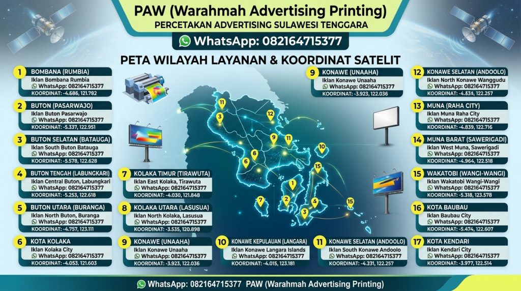 “Solusi branding & iklan 24 jam di Kendari. PAW (Percetakan Advertising Warahmah) melayani cetak digital, reklame, website, hingga kanopi. Kualitas premium, harga kompetitif. Hubungi 0821-6471-5377!”
