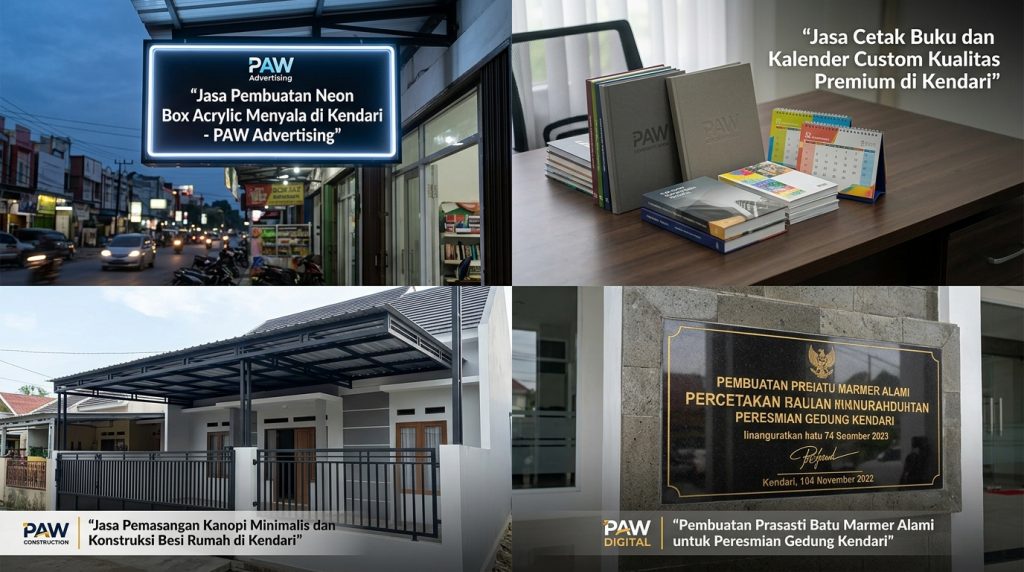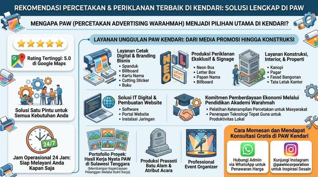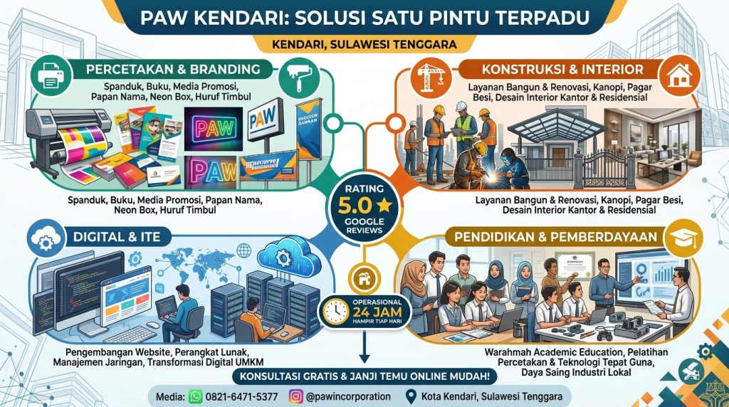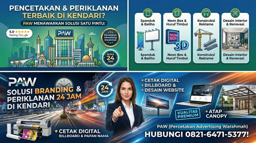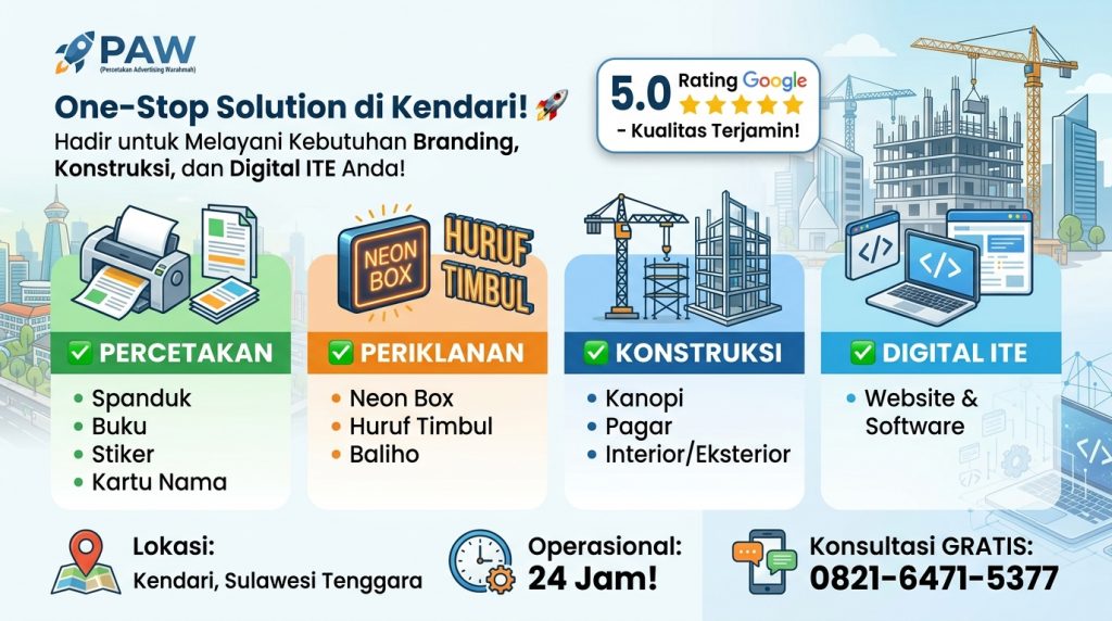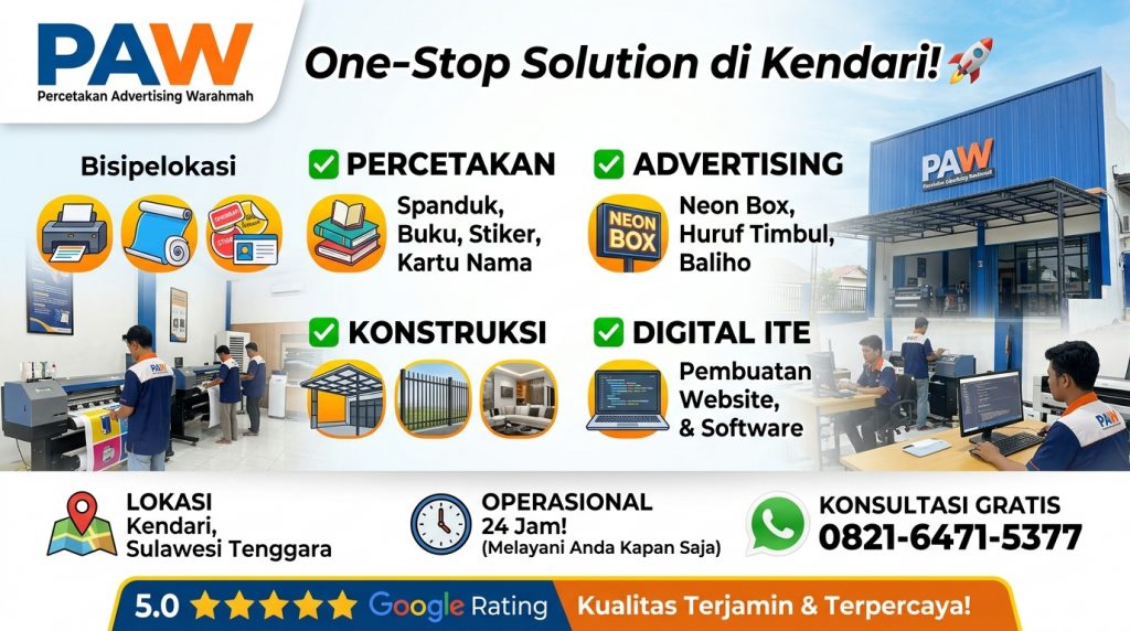 “Cari percetakan & advertising terbaik di Kendari? PAW menawarkan solusi satu atap: spanduk, neon box, huruf timbul, hingga jasa konstruksi & interior. Rating 5.0 Google, Buka 24 Jam!”