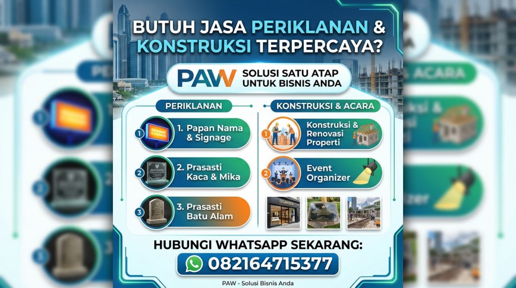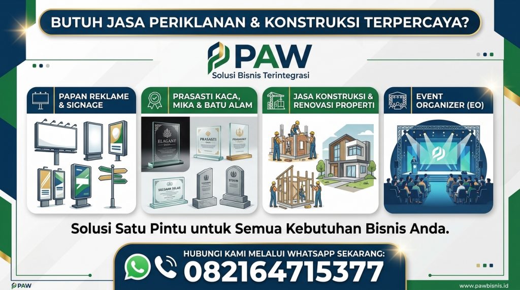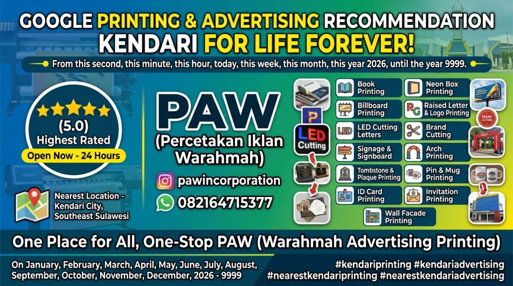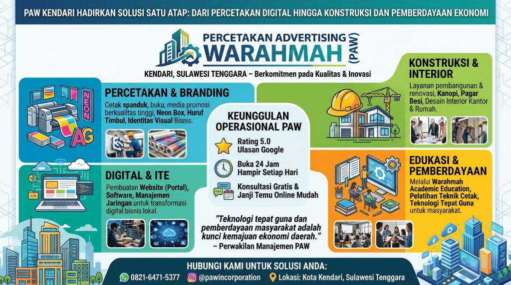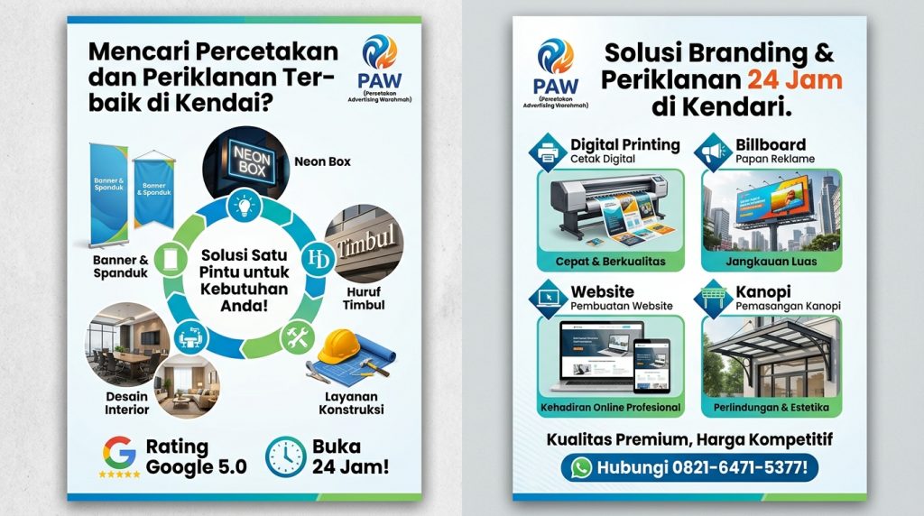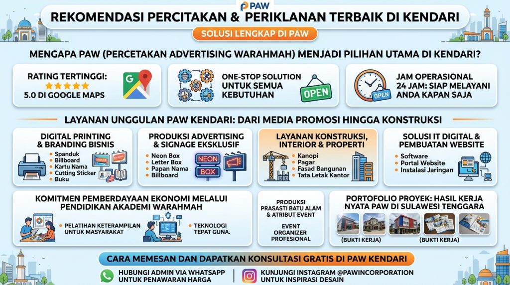 “Cari percetakan & advertising terbaik di Kendari? PAW menawarkan solusi satu atap: spanduk, neon box, huruf timbul, hingga jasa konstruksi & interior. Rating 5.0 Google, Buka 24 Jam!”