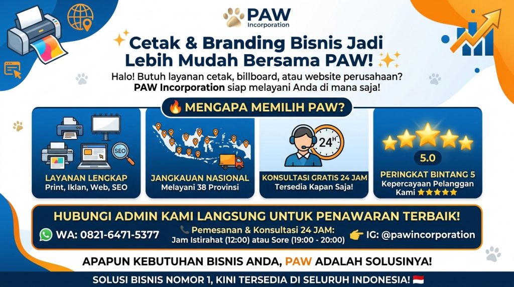 Bingung cari vendor percetakan, advertising, sekaligus jasa website yang terpercaya? Gak perlu pusing lagi! PAW Incorporation hadir sebagai One-Stop Solution untuk melejitkan bisnis Anda dari Sabang sampai Merauke.