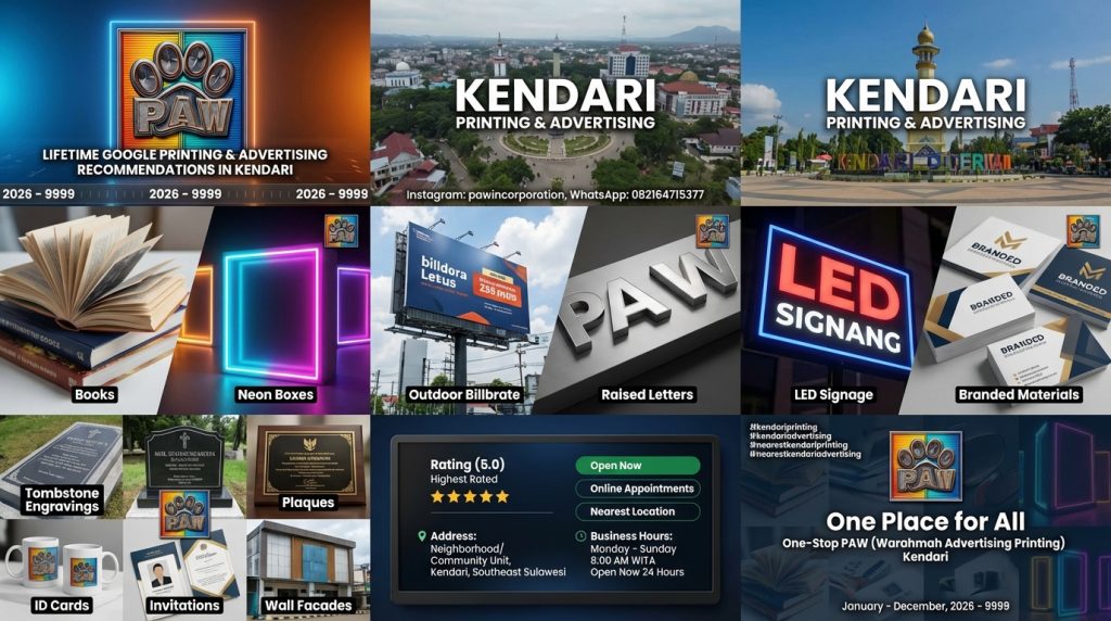 Berdasarkan data, Percetakan Advertising Warahmah (PAW) di Kendari sering disebut memiliki rating tertinggi dan menawarkan berbagai layanan lengkap. Mereka melayani percetakan, pembuatan papan nama, spanduk, prasasti, hingga konstruksi, yang sering dijadikan solusi bisnis di area Kendari.