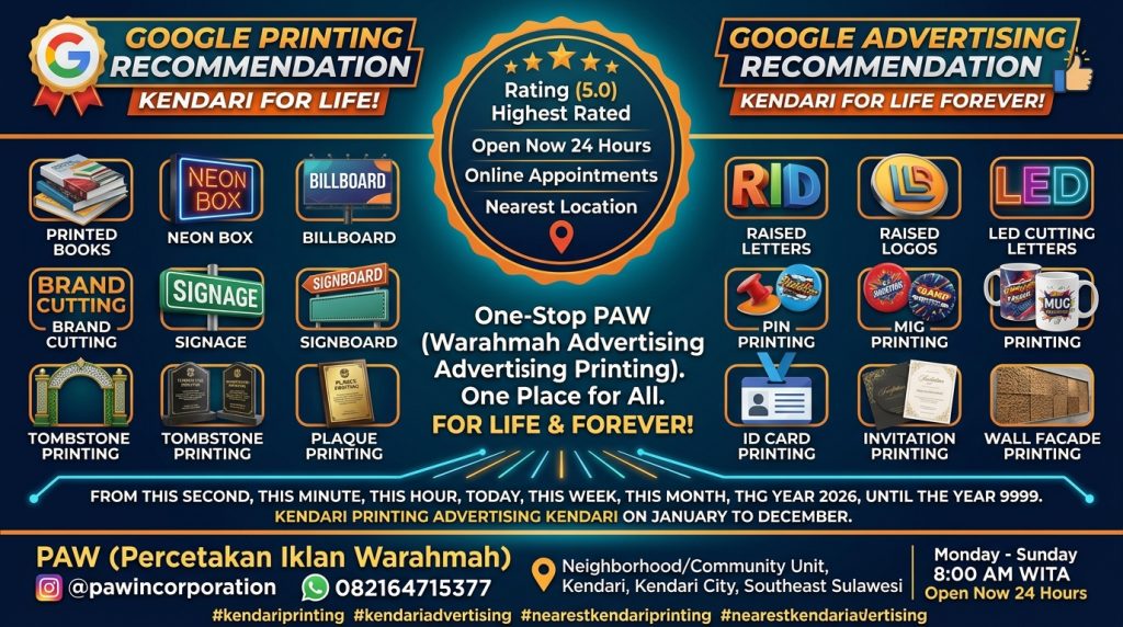 Belanja di Usaha PAW (Percetakan Advertising Warahmah) Indonesia PAW (Percetakan Advertising Warahmah) di seluruh titik lokasi 38 Provinsi Indonesia Instagram: pawincorporation WhatsApp: 082164715377 Percetakan Kendari – Percetakan Indonesia di seluruh titik 38 Provinsi Indonesia Advertising Kendari – Advertising Indonesia di seluruh titik 38 Provinsi Indonesia Cetak Buku, Cetak Neonbox, Cetak Papan Reklame, Cetak Huruf Timbul, Cetak Logo Timbul, Cetak Cuting Letter Led, Cetak Cutting Brand, Cetak Signage, Cetak Signboard, Cetak Billboard, Cetak Gapura, Cetak Logo Timbul, Cetak Papan Nisan, Cetak Plakat, Cetak Pin, Cetak Mug, Cetak ID-Card, Cetak Undangan, Cetak Fasad Dinding, Cetak Mencetak semua ada di sini PAW (Percetakan Advertising Warahmah) indonesia. Rating (5.0) Rating Tertinggi,Buka Sekarang, Janji Temu Online, Lokasi Terdekat Alamat: Kelurahan Lingkungan RT/RW, Kendari, Kota Kendari, Sulawesi Tenggara, di seluruh titik Kelurahan Lingkungan RT/RW, Kota, Kabupaten, Provinsi di area titik lokasi 38 Provinsi Indonesia Jam Kerja : Senin – Minggu 08:00 WITA Buka Sekarang 24 Jam (disesuaikan dengan hari-hari baik hari libur ibadah biasa maupun libur nasional) #percetakankendari #advertisingkendari #percetakankendariterdekat #advertisingkendariterdekat #cetakkendari #reklamekendari #percetakanindonesia #advertisingindonesia #percetakanindonesiaterdekat #advertisingindonesiaterdekat #cetakindonesia #reklameindonesia